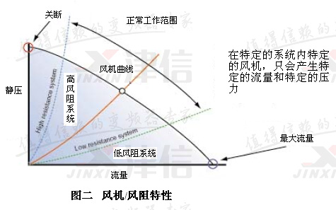 選擇風機的基本原則:在特定的系統里特定的風機,只會產生特定的流量和特定的壓力。風機輸出壓力特性曲線和系統風阻特性曲線的交點就是風機的工作點。