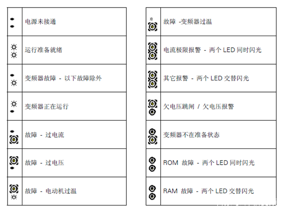 西門子變頻器的上,下兩個(gè)ALM指示燈有四種狀態(tài),分別是燈滅,長亮,快速閃爍,和閃爍,分別代下以下含義: