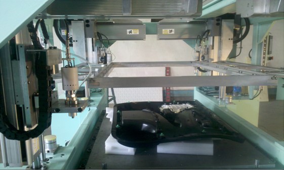 4頭超聲波焊機用于汽車內飾焊接上,有4個獨立的焊頭,每個焊頭上有X、Y、Z三個運動軸。主要有回零、示教、焊點定位、及焊點測試等功能,設有焊頭防撞保護、光柵保護、伺服報警保護,設備暫停等保護功能。設備如圖一所示: