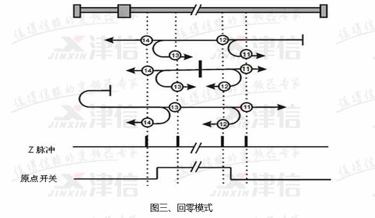 根據客戶要求,選擇的回零方式為:回零時反轉,找到零位信號后,伺服開始正轉,找到第一個Z相脈沖后再偏移一定的原點偏移量,回零方式如圖三所示。